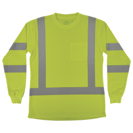The GloWear 8374 Women’s Essential Hi-Vis Long Sleeve T-Shirt designed to enhance visibility in low-light and nighttime conditions with ANSI/ISEA 107-2020, Type R, Class 3 compliant hi-vis fabric and 2” reflective, solid tape.