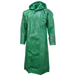 Regarded as the industry's most popular, the Classic Plus Series Material blends the strength and water-proof properties of PVC with the longevity of a polyester backing. The 260C Rider Coat, in a sleek black, measures 60 inches in length and comes with a detachable hood, a snap front, and wrist take-up snaps. It incorporates a corduroy-lined collar for added comfort and a cape-ventilated back to promote airflow. The coat is designed with a split at the back, enabling it to be snapped around each leg, effectively transforming into chaps.