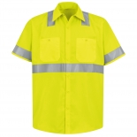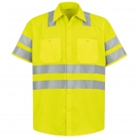 Our short sleeve ripstop shirt is durable, lightweight, and ready to help you get things done. The color-blocking technology hides stains and soil, while the reflective strip across the waist and sleeves makes you more visible in a crowd. The two-piece lined collar with sewn-in stays, along with the button-front closure and gripper neck, will help you maintain a professional and tidy appearance throughout your shift.